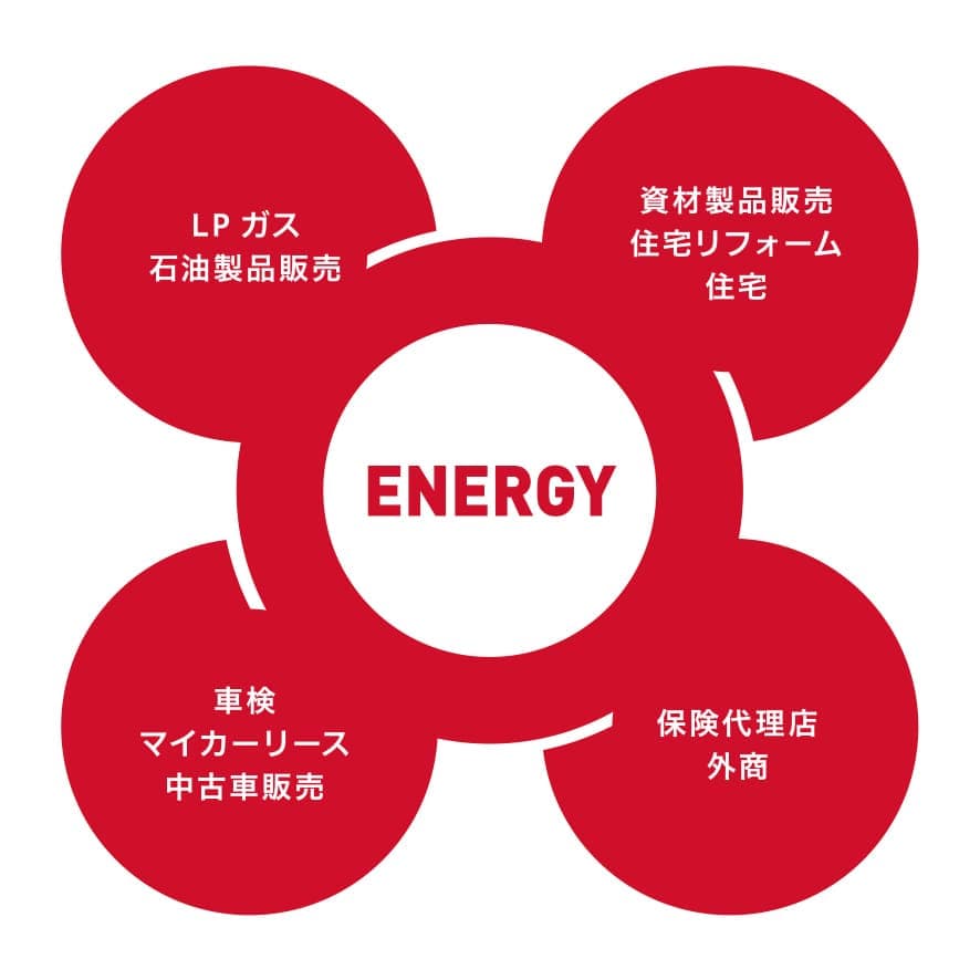 | 事業内容 | LPガス事業 資材製品販売事業 / 住宅リフォーム事業 カーリース / 中古車販売事業 車検業務 石油製品販売事業 ガソリンスタンド 保険代理店業務 環境衛生事業 外商事業 住宅事業 冷暖房設備工事 給排水衛生設備工事 家電製品販売 ギフト・各種物産通販 |
